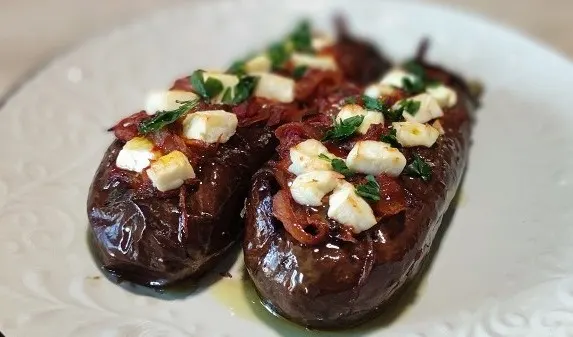 Όταν περάσει το μισάωρο και έχουν ψηθεί οι μελιτζάνες, τις αφαιρούμε από το φούρνο (αφήνουμε τον φούρνο αναμένο) και με ένα κουτάλι πιέζουμε στα σημεία που χαράξαμε δημιουργώντας μια εσοχή για να βάλουμε μέσα τη γέμιση.