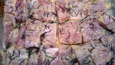 Πασπαλίζουμε με πιπέρι και δενδρολίβανο και αν έχουμε χρόνο καλύπτουμε με μία μεμβράνη και  τα αφήνουμε για 30′ στο ψυγείο ώστε να μαριναριστούν σωστά.