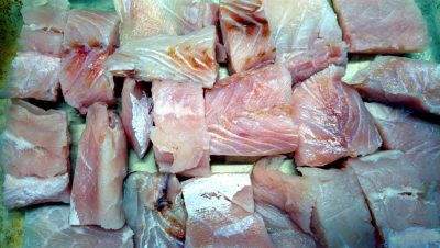 Ξεπλένουμε καλά σε τρεχούμενο νερό τα φιλέτα πέρκας που έχουμε ξεπαγώσει.