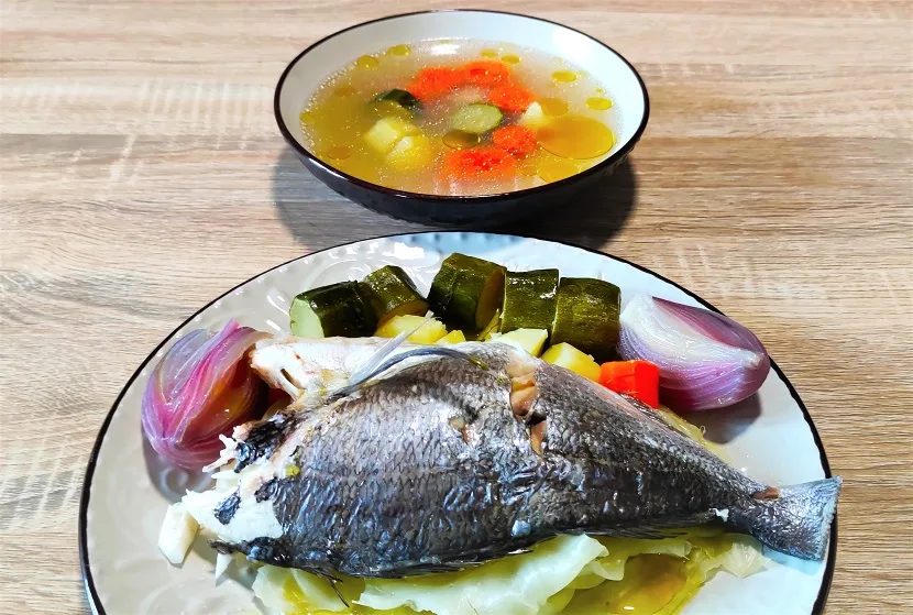 Τοποθετούμε στο πιο πάνω διαμέρισμα τα λαχανικά μας, επίσης χωρίς μπαχαρικά και λάδι. (Πάντα βάζουμε τα λαχανικά στο πιο πάνω διαμέρισμα από το ψάρι ή το κρέας μας ώστε τα ζουμιά τους να στάζουν πάνω στο ψάρι/κρέας και να του δίνουν νοστιμιά. Εκτός της νοστιμιάς, το αντίθετο θα ήταν και επικίνδυνο καθώς το ψάρι/κρέας μπορεί να μολύνει τα λαχανικά με παθογόνους μικροοργανισμούς.)